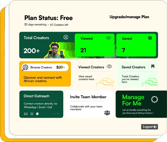 A searchable directory of vetted creators from 10+ African contries with their direct contacts (Email/ Phone/WhatsApp contacts) and ratecards